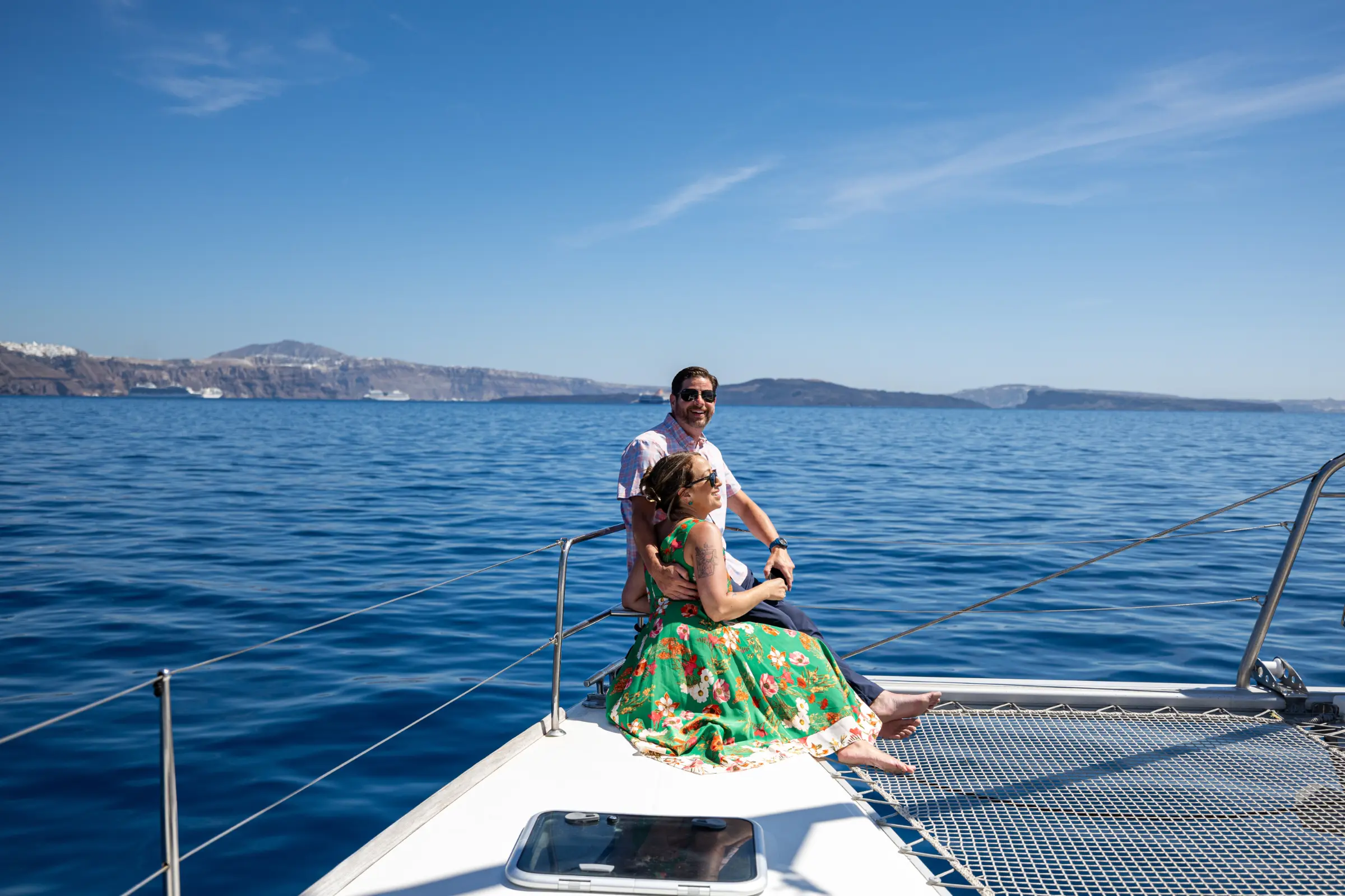 Book your very own private catamaran sailing cruise in Santorni and come aboard our luxurious catamaran sailing yacht for an exclusive and unforgettable experience around the enchanting island of Santorini. Immerse yourself in the allure of the Aegean Sea as we navigate through crystal-clear waters, setting sail to some of Santorini’s most iconic sailing destinations. Our meticulously crafted private sailing cruises offer a bespoke itinerary, ensuring you discover the hidden gems and breathtaking beauty of the region. Explore the vibrant hues of the Red, Black and White beaches, indulge in refreshing swims near Akrotiri, and surrender to the therapeutic allure of the hot springs. As the day unfolds, witness the majesty of the volcano and revel in the panoramic views of Oia and Fira villages. Our expert crew is dedicated to providing a seamless and personalized experience, elevating your journey to new heights of luxury. Escape the ordinary and choose our catamaran for a private sailing cruise that transcends the competition, combining comfort, elegance, and an intimate connection with the stunning landscapes of Santorini. Each cruise is a tailored masterpiece, promising memories that will linger long after your vacation in Santorini Greece!