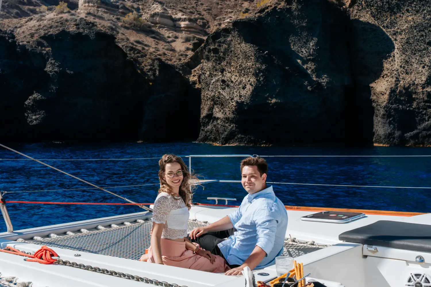 Our Santorini Private Catamaran Sailing Tours invite you to join us on a one in a life time santorini sunset cruise, where the stunning landscapes of Santorini serve as the backdrop to your exclusive sailing cruise. Immerse yourself in the epitome of opulence as you step aboard our private catamaran tour, meticulously designed for comfort and style. With a dedicated crew at your service, chart a course through the crystalline waters, capturing the essence of Santorini’s beauty from the deck of your own floating paradise. Indulge in the tranquility of a sunset private tour, where every moment is tailored to your desires. Whether you seek a romantic sunset cruise, a family sailing tour around the island, or a day of blissful relaxation, our expert captains will guide you to hidden gems and iconic landmarks, sharing the rich history and captivating stories of this enchanting Greek island, Santorini. Savor Greek cuisine inspired flavors and refreshing beverages but also local exquisite wine prepared on board, as you bask in the warm Mediterranean sun. Dive into the refreshing sea, explore secluded coves, and relish the freedom of sailing at your own pace. Our Santorini Private Catamaran Sailing Tours promise an unparalleled escape, where luxury meets the natural wonders of the Cyclades. Book your private catamaran tour with us and elevate your Santorini experience to new heights. Join us for a journey of a lifetime, where the magic of the Aegean unfolds with every gentle breeze.