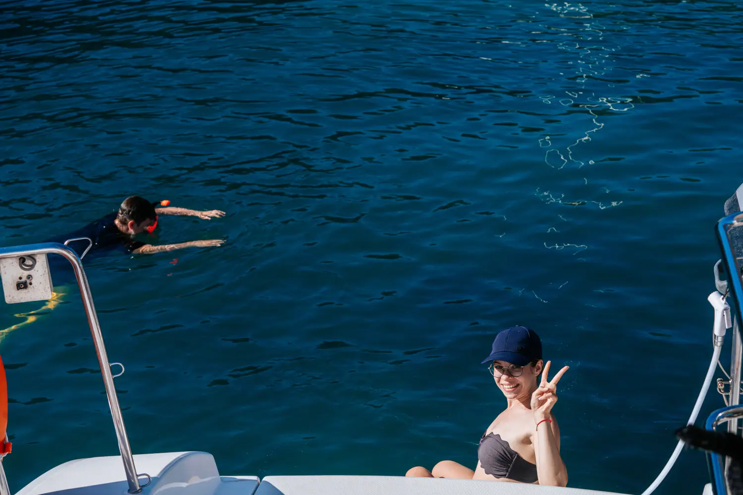 As you set sail from the charming port, immerse yourself in the breathtaking panorama of the Aegean Sea, dotted with iconic whitewashed villages perched atop dramatic cliffs. Feel the gentle sea breeze caress your skin as you glide effortlessly on the crystal-clear waters aboard our luxurious catamaran.